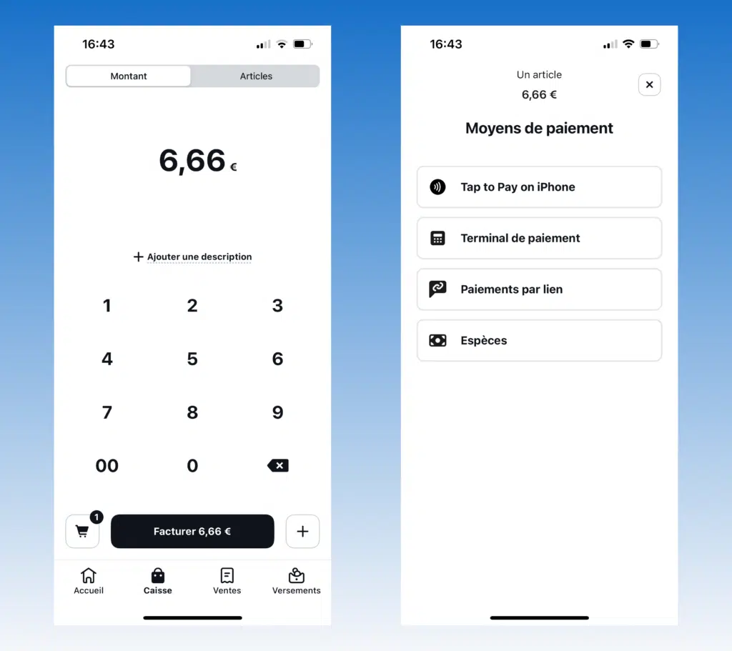 Au moment de la vente, vous pouvez choisir entre le lecteur de carte, le tap to pay Sumup , les liens de paiement et Espèces.