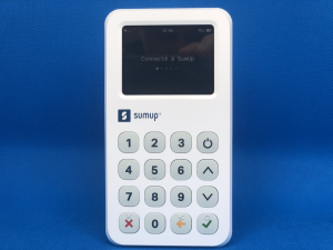 Le SumUp Air est le lecteur à la taille mini (84 x 84 x 23 mm) de l’entreprise allemande SumUp. L’encaissement se fait depuis l’application SumUp sur votre smartphone. Il suffit de renseigner le montant sur l’application puis de valider. Alors le lecteur s’allume, se connecte et invite le client à payer automatiquement et très rapidement.